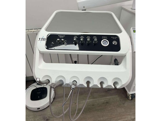 Pensée pour optimiser l’ergonomie et le confort de travail, elle est équipée d’un boîtier technique avec cordons pendants, monté sur bras rotatif compensé et réglable en hauteur pour s’ajuster précisément à la posture de chaque praticien. Le compresseur est directement intégré à l’unité, garantissant un gain de place sans sacrifier la performance.